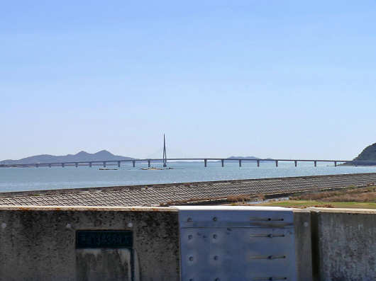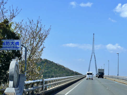 しばらくすると「周防大橋」が見えてきましたが、橋の中央付近には吊り橋の支柱が見えるのに、橋桁を支える斜めに張られたワイヤーが全く見えない不思議な構造の橋でした。
