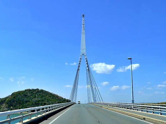 橋を渡り始めるとようやく斜めに張られたワイヤー部分が見えてきました。周防大橋は全長1080m、支柱の高さ71mの橋ですが、支柱の前後の180mのみが吊り橋で、それ以外の前後合わせて900mの部分は普通の構造の橋だそうです。