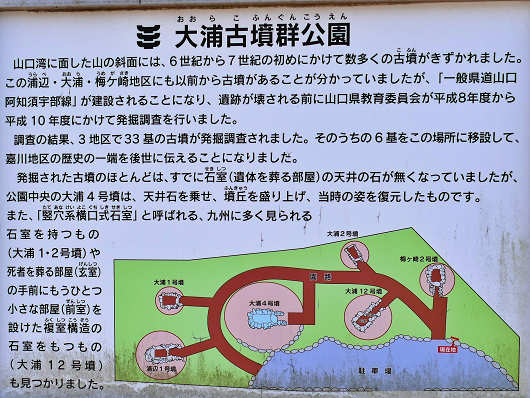 「大浦古墳群公園」の説明板です。これによるとこの辺りの浦部、大浦、梅ヶ崎の3地区には33基の古墳があって、県道建設に伴ってその内の6基がここに移築されたそうです。
