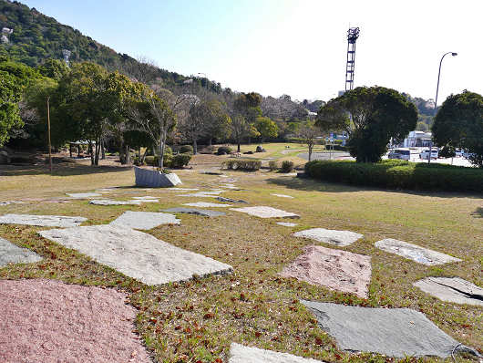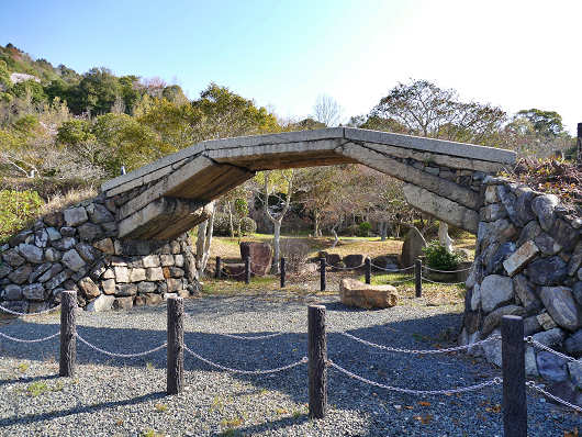 緑地の中央部には珍しい形をした石橋がありますが、この石橋は「升築(ますつき)らんかん橋」といって、かつて塩の生産が盛んだったこの辺りの塩田地帯の川に架かっていた石橋を移築したものだそうです。全国一石橋が多いと言われる大分県院内町でも、この様な橋桁を両方から突き合せたような珍しい石橋は見たことが無いですね。