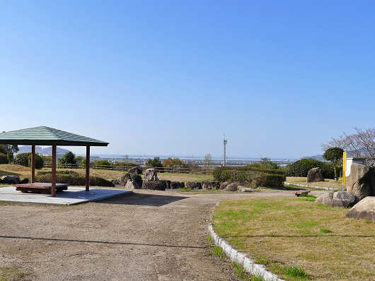 下りSAは上りSAよりも高い位置にあるので、緑地の端っこからすぐ足元を眺めると、目の前に上りSAと山陽道が見えますが、その先のほうに目をやると、防府市の街並みや瀬戸内海を望むことができます。