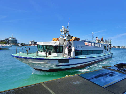乗船券を買って桟橋で船を待っていると、唐戸市場からのお客さんを乗せた船が戻ってきました。乗客が降りたらこの船に乗り込みましたが、この船は門司港と唐戸市場の間をひっきりなしに行き来しているようで、着岸して乗客を乗せたらすぐに門司港を出港しました。