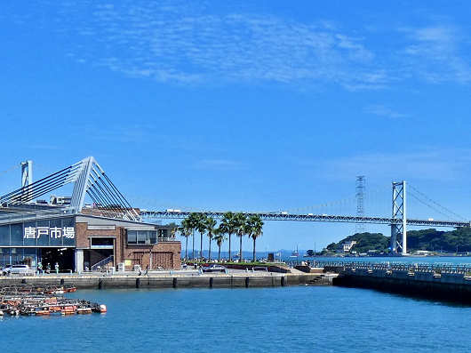 船を降りて桟橋から眺めた下関地方卸売市場の「唐戸市場」と、その向こうに見える関門橋です。これから唐戸市場へ向かい市場内の鮮魚直売所で新鮮な海鮮料理を買ってお昼ご飯にしますが、九州中部の大分県に住んでいると、関門海峡を渡って本州に上陸?しただけで、はるか遠くの異国の地へ来たような気分になるのは私だけでしょうか(笑)
