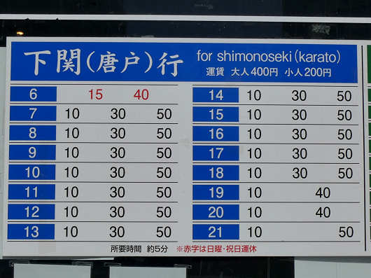 時刻表です。これを見ると20分おきに船が出ているようなので、乗り損なってもすぐに次の便が来るので安心ですね。唐戸市場と門司港レトロの両方を訪れる人にとっては、高速に乗って関門橋を往復したり、車を停め直す手間も無いので、どちらかに車を停めたままで船で移動する方が便利ですね。