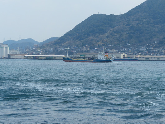 関門海峡はとっても狭い海峡なので、風も無い穏やかな天気なのにこんなに白波を立てて渦巻いたような潮流が流れていました、