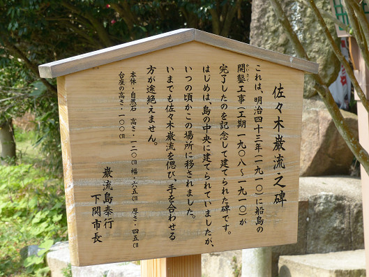 立て札のところまで行ってみると”佐々木巌流之碑”って書いてました、佐々木巌流って佐々木小次郎の事だよね、去年の12月にお出かけした時に錦帯橋で小次郎の銅像があったから佐々木小次郎って山口県岩国市の生まれなのかな? その時の記事は ここ をクリックしてね、