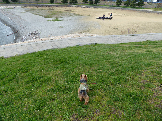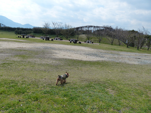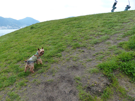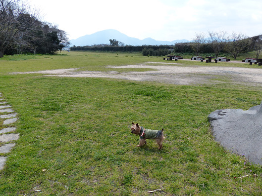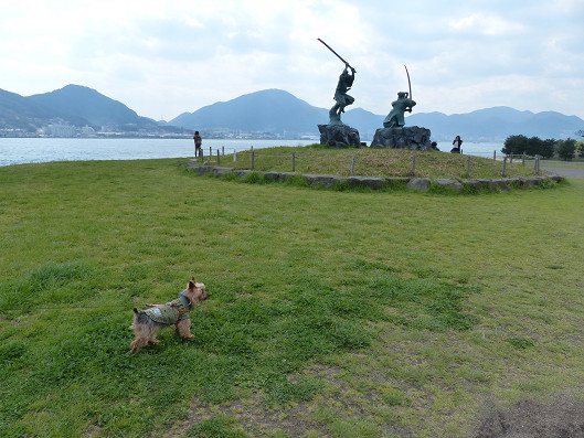巌流島は無人島なんだけどきれいに整備されたこんなに広いところもあります、この島では車も走って無いし、観光客以外は人もいないからまるで広大なドッグランにいるみたいだね、