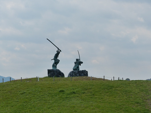 りゅう君は坂を登って武蔵と小次郎の決闘シーンの像を目指します、