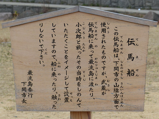 伝馬船の横にはこんな立て札がありました、400年前に武蔵もこんな船で小次郎との決闘のために巌流島へ渡ったんだろうね、
