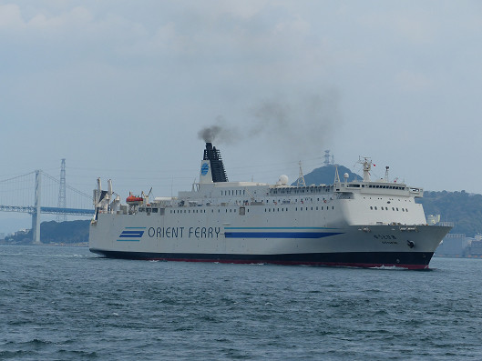 さらにお散歩を続けていたら狭い関門海峡を通って大型フェリーが日本海側へと出て行きました、オリエント・フェリーって下関と中国の青島を結ぶ国際フェリーです、