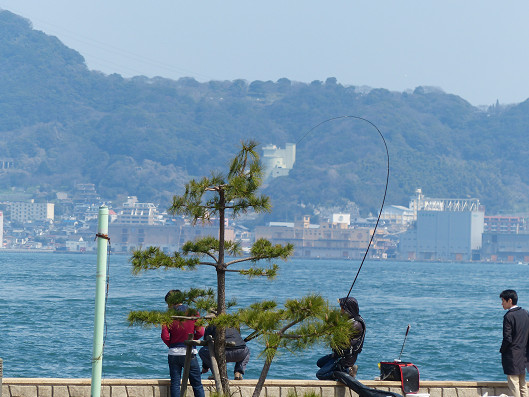 船が出港する時にふと岸壁を見たら、釣り人の竿が満月のように大きくしなっていました、かなりの大物が釣れたみたいです、でも船がすぐに出港したので残念ながら獲物を見る事は出来ませんでした、