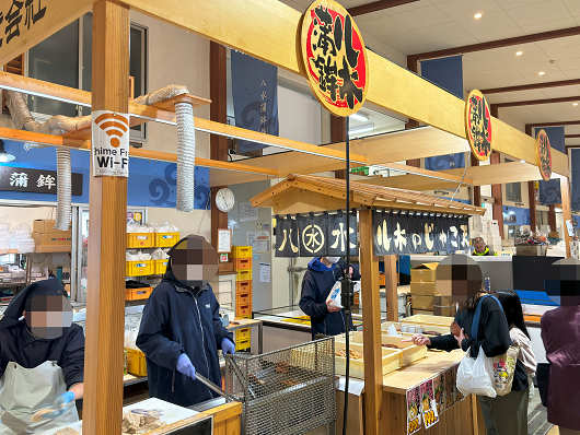 どーや市場の一角には愛媛県名物のじゃこ天の実演販売も行われていました。そして同じ建物内には海鮮バーベキュー、海鮮食堂の「どーや食堂」もありました。