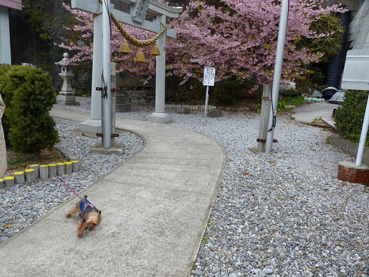 ここには小さな神社があって境内に河津桜が咲いていたので中へ入ろうとしたらママから入っちゃダメだよって怒られました、何でだろうね?