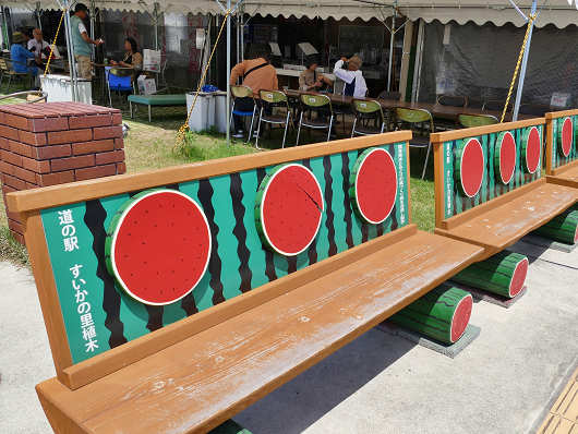 休憩所にはベンチもありましたが、熊本市植木町は日本一のスイカの産地なので、ベンチの背もたれ部分もスイカのデザインでした。