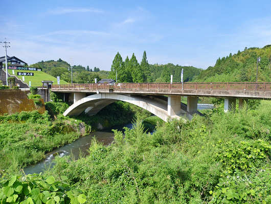 道の駅「人吉」の前には鳩胸川という川が谷のようなところを流れているので、道の駅へ行くにはこの橋を渡りますが、橋を渡った先の高台の上に道の駅があるので、お城に向かっているような感じです(笑)