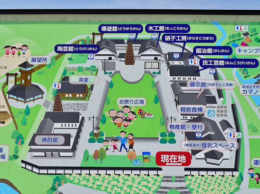 道の駅「人吉」の案内図です。これらの施設はすべて高台の上にありますが、物産館やレストラン、展望所の他に木工館やガラス工房など工芸体験ができる建物が6棟ほどありました。