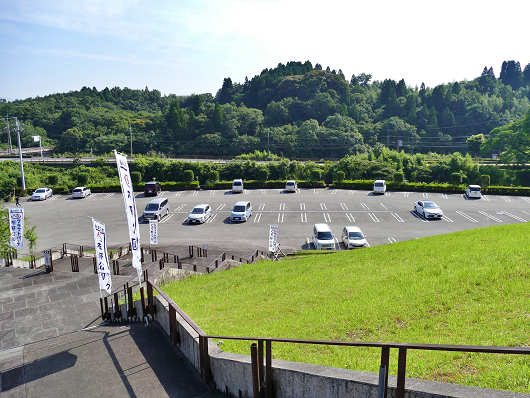 高台から眺めた道の駅の駐車場です。駐車場には普通車が100台程度と大型車が7台停められるそうなので、駐車場の規模的には特別に大きな道の駅じゃありませんが、道の駅の施設はすべてこの高台にあって、元がテーマパークだっただけに施設的にはかなり大規模な道の駅です。