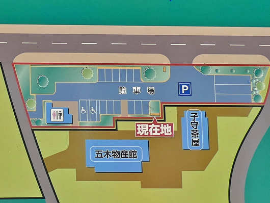 道の駅「子守唄の里 五木」の案内図です。これを見ると駐車場はほんのわずかですが、別の案内図には物産館の裏手にも駐車場が表示されていて、国道を挟んだ向かいにある温泉施設の駐車場も含めると普通車が54台停められるとも書かれていました。