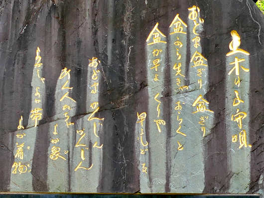ここには五木の子守唄の歌碑や、子守をする少女の像などもありました。五木の子守唄は熊本県を代表する民謡のひとつですが、歌詞の内容は乳飲み子をあやす優しい唄というよりも、子守の少女が自分の貧しい境遇を嘆いて、辛い日々の生活を表現した悲しい唄なんですよね。