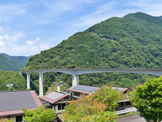 道の駅の前にはこの様な景色が広がっています。下に見える建物は高校ですが、道の駅の前は深い谷になっているので、高校もこんな低いところに建っているんですね。そしてその向こうに見える橋脚の長い橋は「頭地大橋(とうぢおおはし)」といって、この橋を渡って深い山の中をさらに40kmほど先へ進むと八代市、氷川町へと出ます。