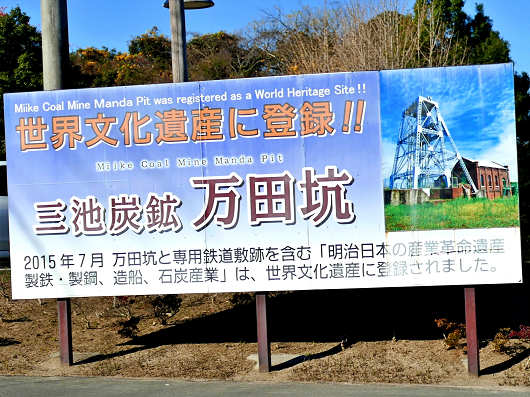 万田坑へは宮原坑から南に向かって4㎞ほど走りましたが、途中までは前方に大きな観覧車が見えていたので、熊本県荒尾市にある九州最大級の遊園地「グリーンランド」の大観覧車だったんでしょね?観覧車が見えなくなってしばらくすると、世界遺産 万田坑の大きな看板が交差点に見えてきたのでここを右折しました。