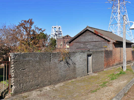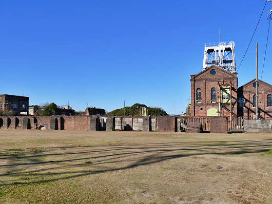 第二竪坑櫓の手前まで来ましたが、ここはこれまで見てきた二ヵ所の炭鉱跡のようにごく一部の施設などが残っているだけじゃなくて、炭坑の広い敷地内に施設全体が炭鉱遺構として残っているような感じでした。