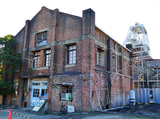 このレンガ造りの建物は上の全体写真の中ではいちばん左に写っている建物で「事務所(旧扇風機室)」と説明板に書かれていて、当初は坑内の換気を行う大型の扇風機が設置されていて、閉坑後は坑内の監視や事務所として利用されたそうです。