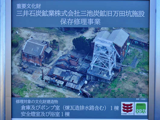 ここにはこの様な写真パネルがあって、この時保存工事を行っていたのは第二竪坑櫓の左側にある低い建物の「倉庫及びポンプ室」と「安全燈室及び浴室」の2棟でした。