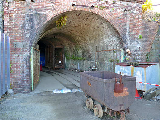 第二竪坑の坑口です。このトンネルの真上に第二竪坑櫓が建っています。ちなみにこの竪坑は深さが264mもあって、ケージ(ゴンドラ)に乘って1分間で地底に到着していたそうです。