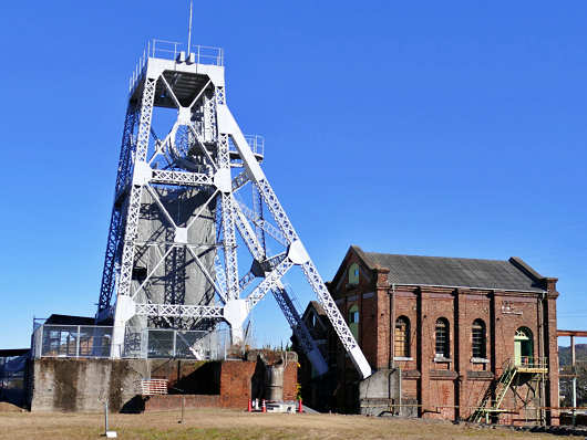 順路に従って第二竪坑の坑口を過ぎると、第二竪坑櫓が最も近くで見える広場のようななところに出ます。この竪坑櫓は18.8mあるそうです。櫓の横には巻上げ機室も見えますが、ここは最後に見物します。