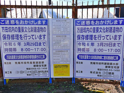ここにもボランティアの人がいて、一定時間毎に見学路を廻りながら説明をしてくれますが、かなり時間がかかりそうだったので、一人で見物しようと順路に従って歩き始めるとすぐに工事看板が見えてきて、施設の一部は残念ながら来年の3月までは見物ができないようでした。