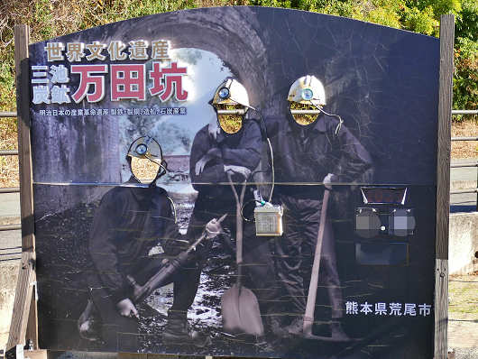 万田坑ステーションの前には顔ハメパネルがあって、下のほうには熊本県荒尾市と書かれていました。ここへ来る前に見てきた三井三池炭鉱の二つの遺構は福岡県大牟田市にありましたが、同じ三井三池炭鉱でも万田坑があるのは熊本県荒尾市なんですね。