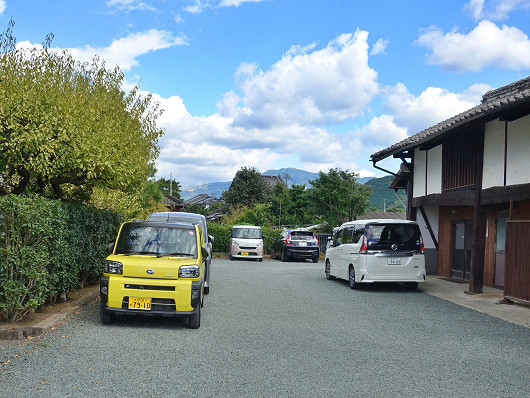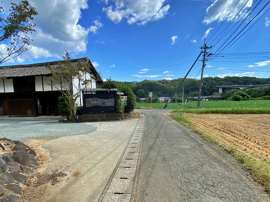看板の矢印に従って左折すると、車同士がすれ違えないほどの狭い農道のような道になって、田んぼの中を150mも進むと左側に白壁造りの古民家のような建物が見えてきました。