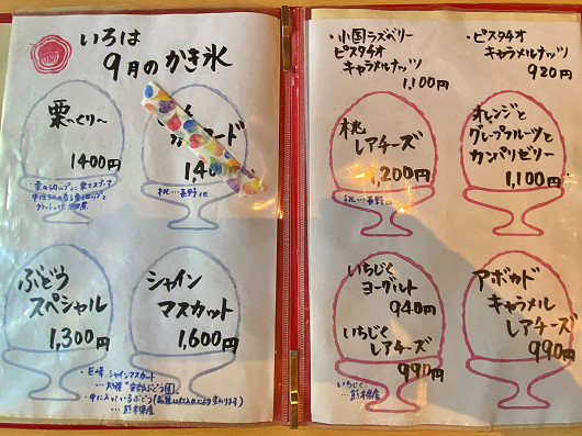 席に座ったらさっそくかき氷の注文ですが、今回はブログの掲載がちょっと遅れたのでメニューは9月のかき氷です。りゅうママは旬の果物が大好きなので、「栗っくり~」を注文する気満々でしたが、すでに売り切れていたので「桃レアチーズ」を、私はかき氷の絵が無くて文字だけの「小国ラズベリー ピスタチオ キャラメルナッツ」を注文しました。