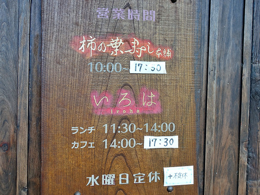 営業時間の案内です。カフェタイムは14時から17時30分になっていましたが、ここはランチタイムのコース料理も人気で、柿の葉寿しのお持ち帰りもできるようでした。