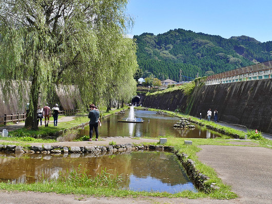 高森湧水トンネル公園の駐車場はトンネルのすぐ上と、この水路の下流側とに、どちらも広い無料駐車場があります。トンネルの上に車を停めたらすぐトンネルへと入れますが、私たちは水路の下流側に車を停めて、水路沿いの遊歩道をトンネル内から湧き出す清流や魚を眺めながら400mほど歩きました。