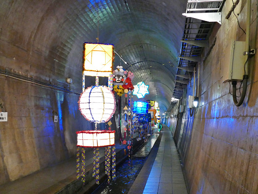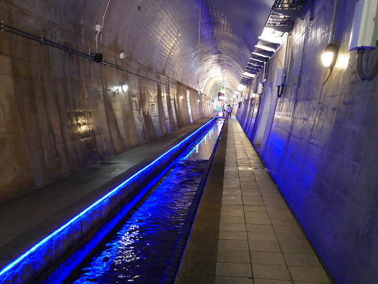トンネルの入口で料金300円を払ったら、さっそくトンネル内へと入りました。トンネル内は中央部に水路が流れていて、その両側に歩道がありますが、一方通行なのでトンネルの終点までは右側を歩きます。