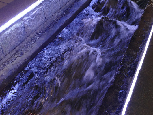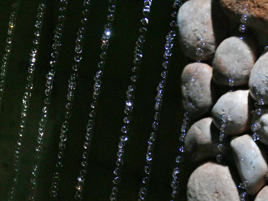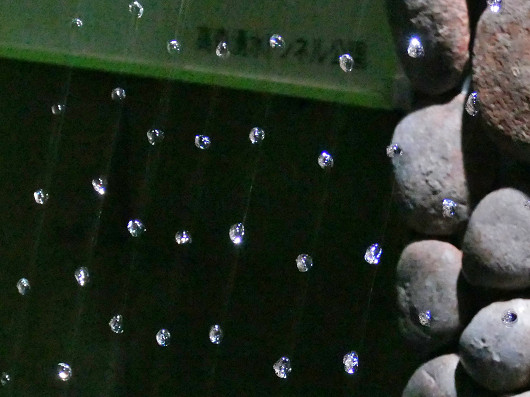 ウォーターパールは流れ出る水に特殊な音波を当てて球体にしたものを、ストロボの発光間隔を変えることで、球体が停まって見えたり、上へ動いたりして見える不思議なものです。この画像は普通に水が流れている状態ですが・・・