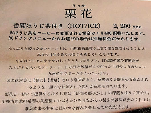 栗花にはこの様な詳しい説明も書かれていて、セットになっている岳間ほうじ茶についても詳しく書かれていました。