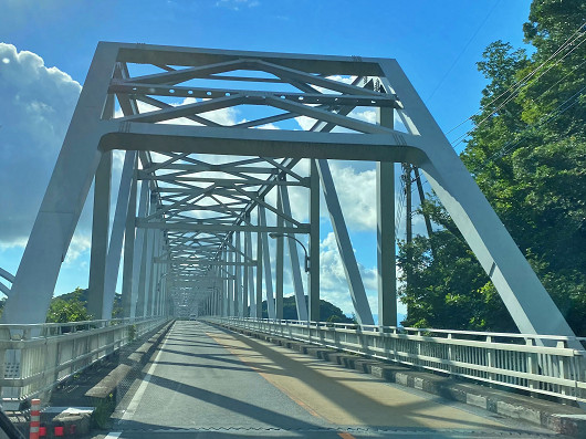 ここからは今渡って来たばかりの天門橋と昨日渡った天城橋が見えます。ちょうど2つの橋が重なり合っているのでひとつの橋のように見えますが、手前の大きなアーチが天城橋で、その奥の鉄骨を組み合わせたような構造の橋が天門橋です。