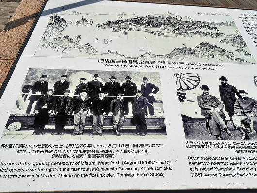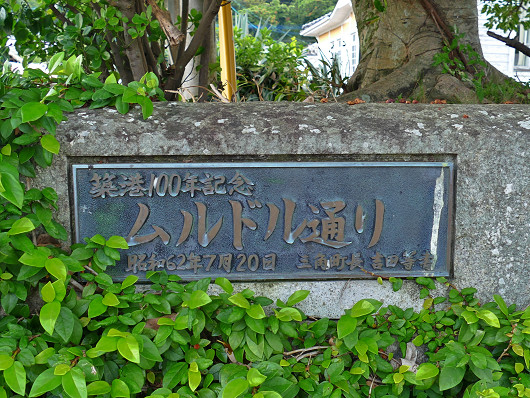 この石畳の通りは「ムルドル通り」と名付けられていますが、ムルドルは三角西港の設計をしたオランダ人技師の「ローエンホルスト・ムルドル」のことです。銘板を見ると昭和62年時点で築港100年記念ってことは、現在では築港134年になりますね。