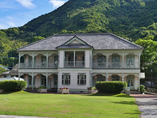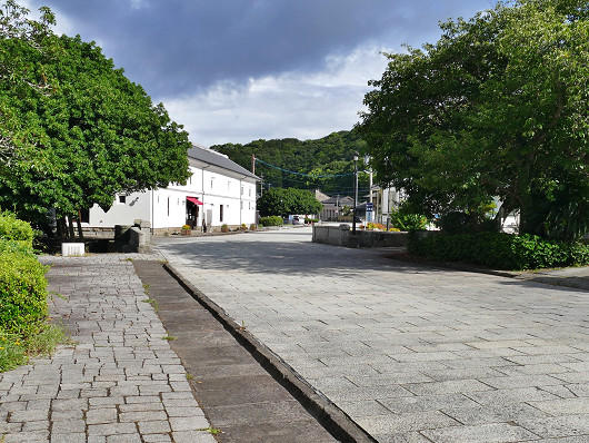 石畳の通りをさらに進んで行くと白壁の大きな建物が見えてきますが、ここは「旧三角海運倉庫」で、三角西港が築港された当時に立てられた現存する唯一の建物で、現在はレストラン・カフェとして利用されています。