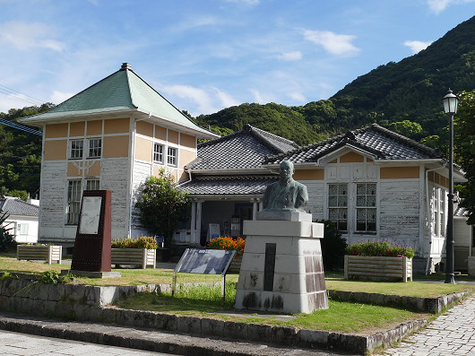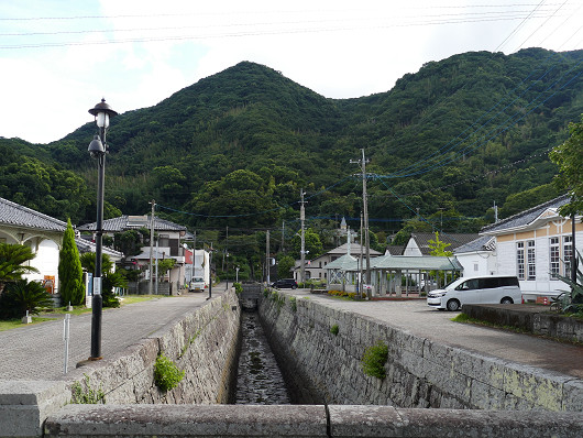 港の中央付近には石積みの水路もありますが、この水路は「中の水路」と呼ばれて、石積みふ頭とともに世界文化遺産に登録されています。この水路の先に見える山を少し登ると「旧三角簡易裁判所 本館」もあります。