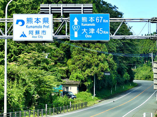 国道57号へ出たら阿蘇方面へ進み熊本県へ入りましたが、次の目的地へは決められた時間までに着く必要があったので、いつもは休憩に立ち寄る道の駅「阿蘇」は素通りして、国道57号を阿蘇盆地の西側の出口に当る立野までひたすら走りました。