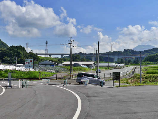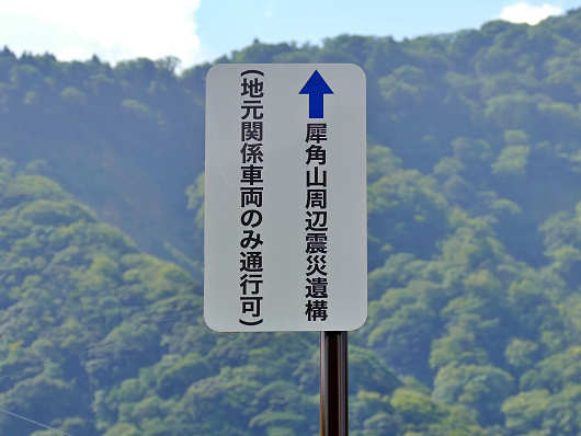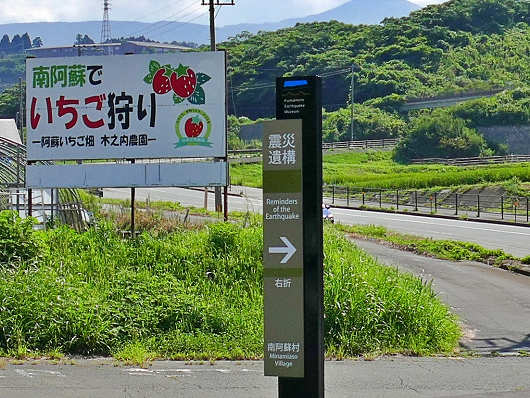 玉来ダムの見物に時間をかけ過ぎて、立野橋梁の上を走る列車の撮影に間に合わなかったのは残念でしたが、立野ダム展望所を出発して阿蘇長陽大橋へ向かっていると、道路沿いに「震災遺構」と書かれた標識が見えてきたのでここに車を停めました。
