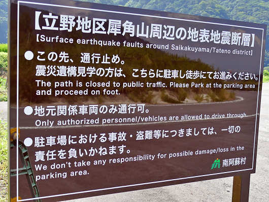 駐車場には案内板が立てられていて、ここにあるのは「立野地区 犀角山周辺の地表地震断層」という震災遺構のようでした。そしてここからは徒歩で向かうとも書かれていました。