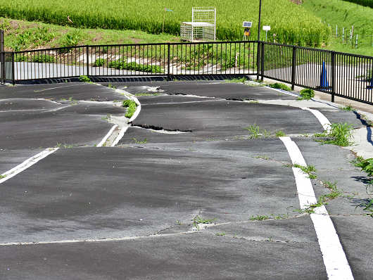 道路の途切れたところから振り返って地面を眺めると、いくつもの亀裂が走って白線が左右に大きくずれた路面が見えました。そして向こうの方の山には地震で崩れ落ちた斜面の傷痕が今でもはっきりと残っていました。