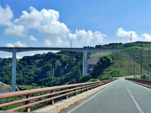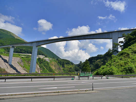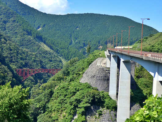 この画像は阿蘇長陽大橋を渡ったところにある展望所から眺めた新阿蘇大橋です。「ヨ・ミュール」からは新阿蘇大橋の橋脚などは見下ろすような感じで眺めますが、ここからは新阿蘇大橋を見上げるので、97mもある高い橋脚の巨大さをより感じることができるんですよね。