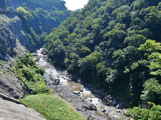 展望所からすぐ下を眺めえると、阿蘇五岳の根子岳を源流とする一級河川の白川が渓谷の深い谷底を流れていました。この辺りはこれまでに何度も訪れているところですが、何故かいつ訪れても白川も黒川も濁った水が流れていて、澄んだ流れは一度も見たことが無いんですよね。