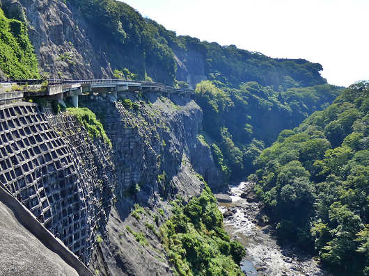 そして深い渓谷の崖上を見ると、断崖絶壁に張り付くように造られた道路が見えました。一見すると大きな地震が発生したら崩れ落ちそうな感じに見えますが、この道路は熊本地震では壊滅的な被害は受けなくて、熊本地震発生後いち早く阿蘇長陽大橋と共に復旧されて、崩落した阿蘇大橋の代替路として車が通れるようになったんですよね。